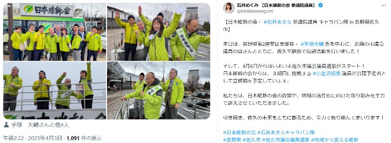 石井氏の活動歴をみると各地で維新の新人候補らの街頭演説に参加してきた。SNS上でも多数、確認できる。吉村洋文代表ら人気どころの幹部ではないが、石井氏の応援は需要があるようだ。