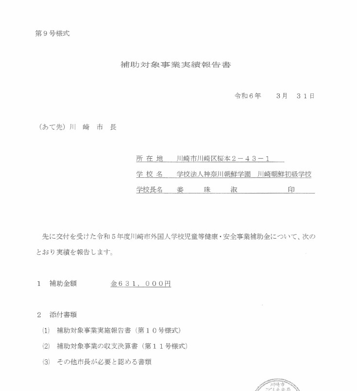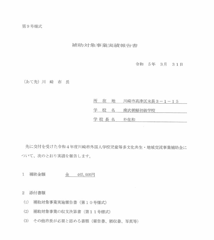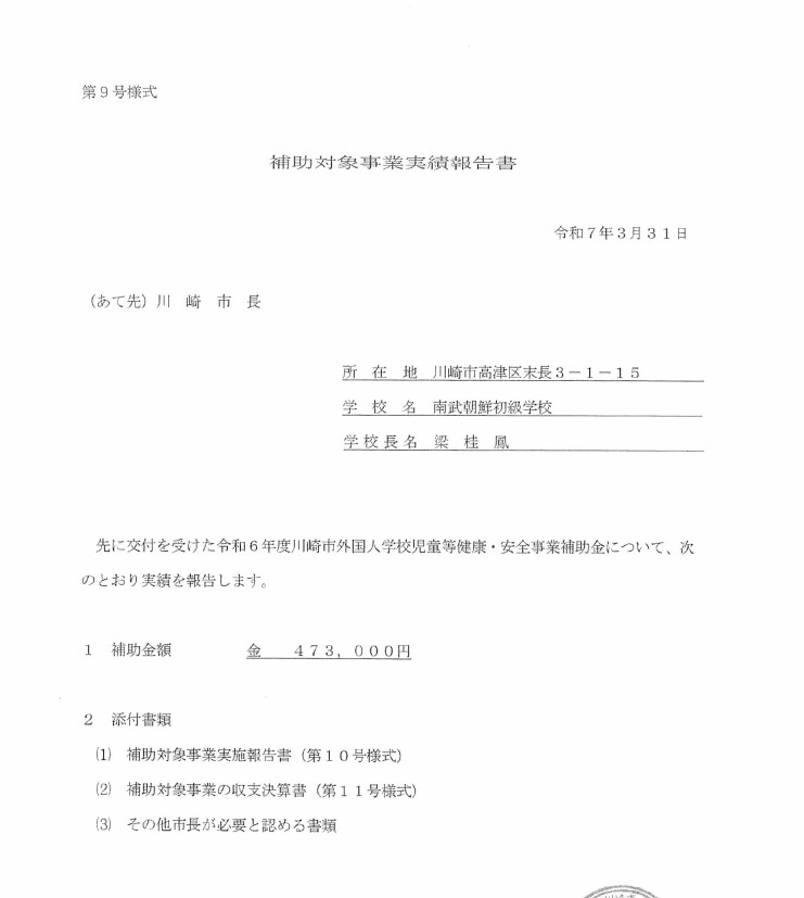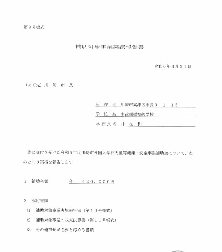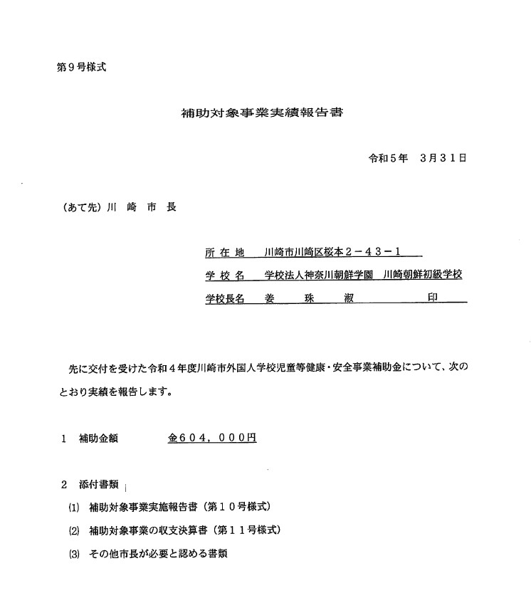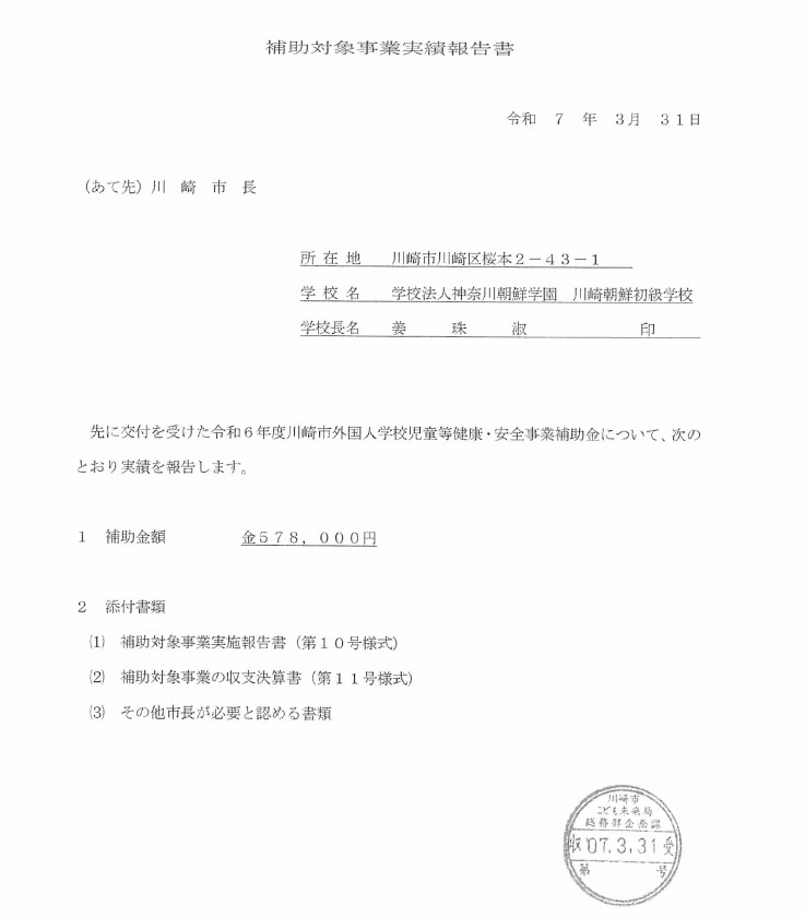 現在は川崎朝鮮初級学校(桜本2、40名)と南武朝鮮初級学校(川崎市高津区、生徒数32名)に補助金が支給されている。直近の支給額を情報開示請求した。