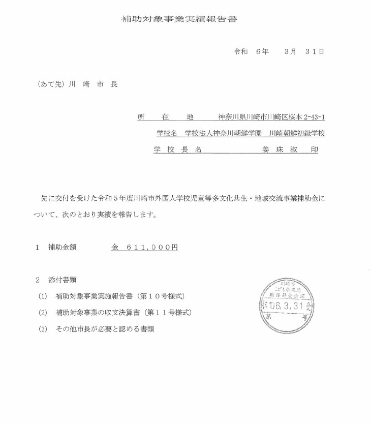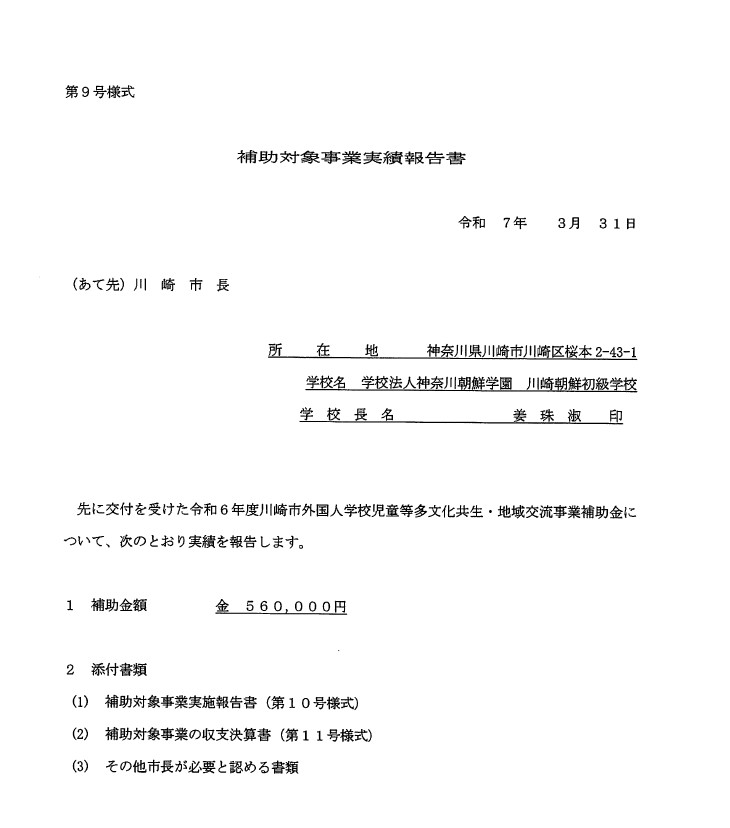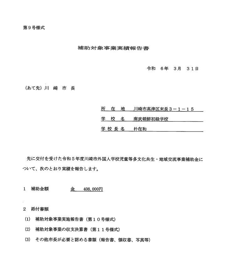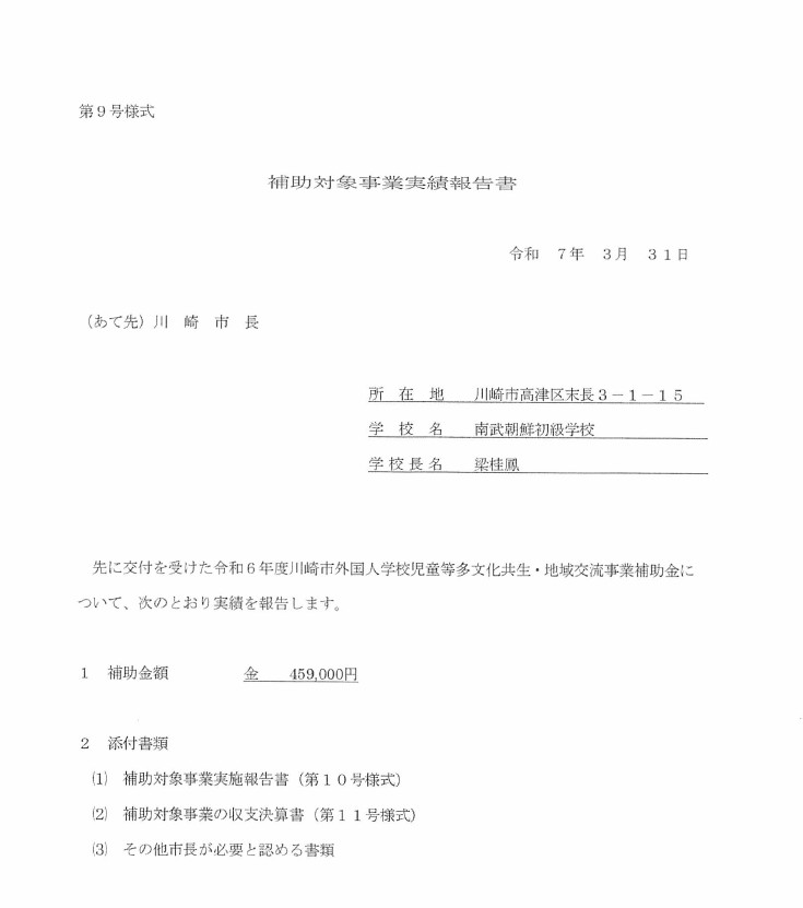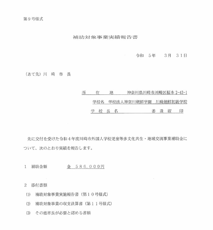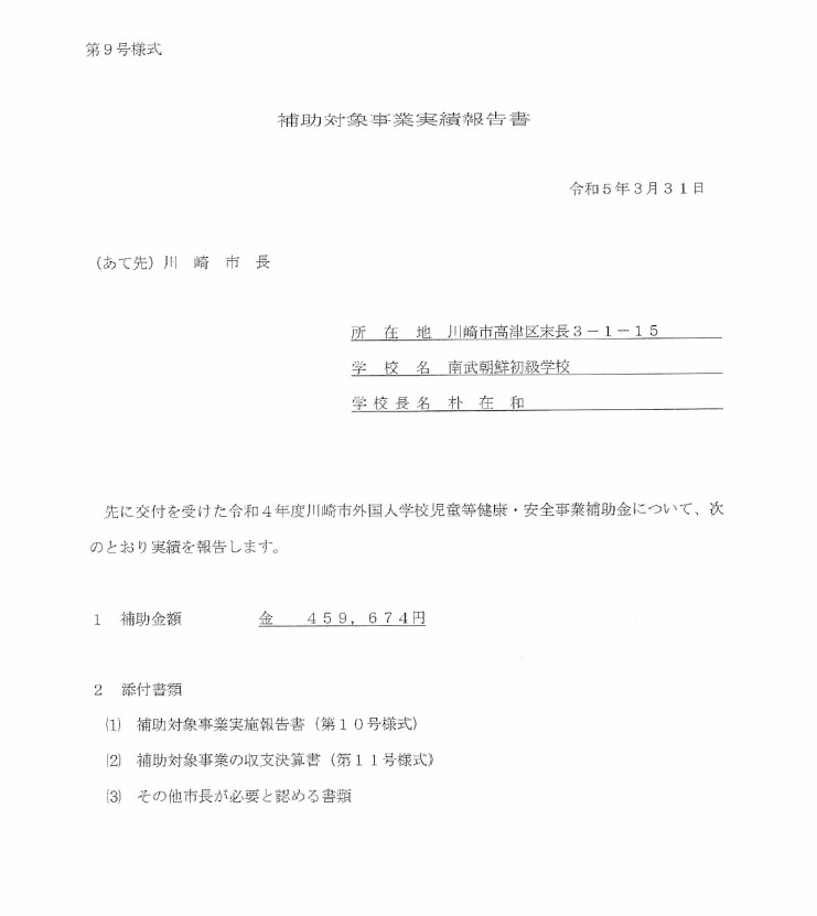 現在は川崎朝鮮初級学校(桜本2、40名)と南武朝鮮初級学校(川崎市高津区、生徒数32名)に補助金が支給されている。直近の支給額を情報開示請求した。