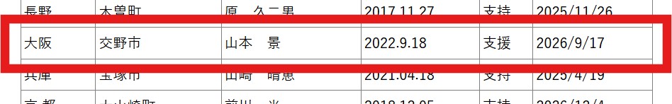 現在でも「交野市 山本景 支援」と掲載されているが不思議だ。どうやら更新されていないページも残っているようでパワハラ報道以降、最新版では削除されていた。