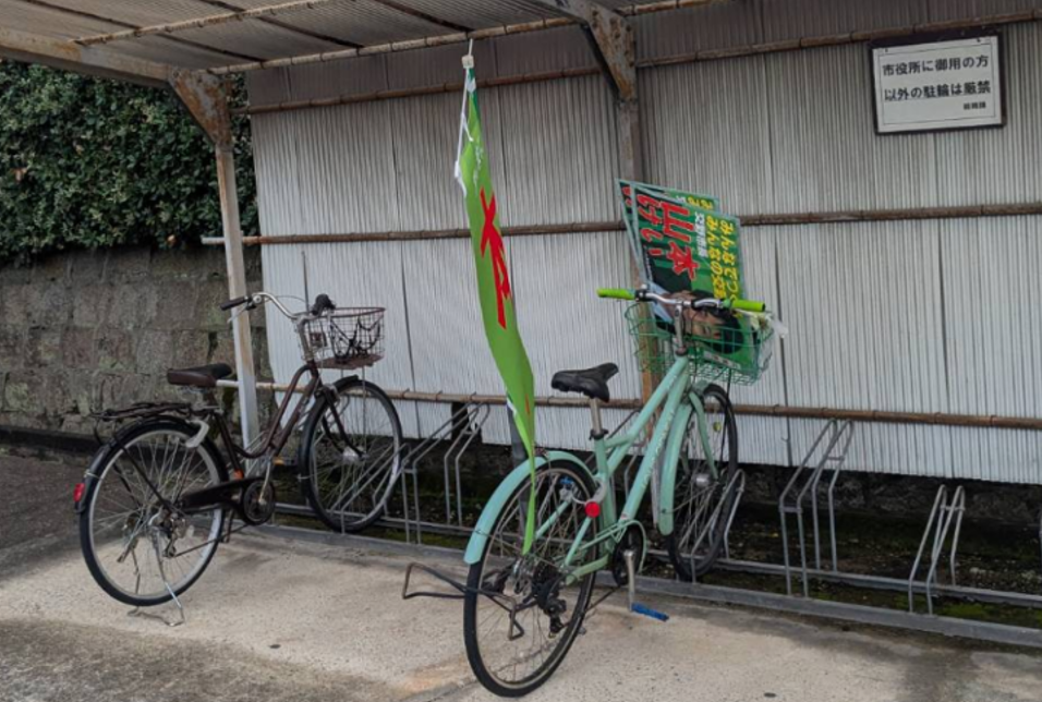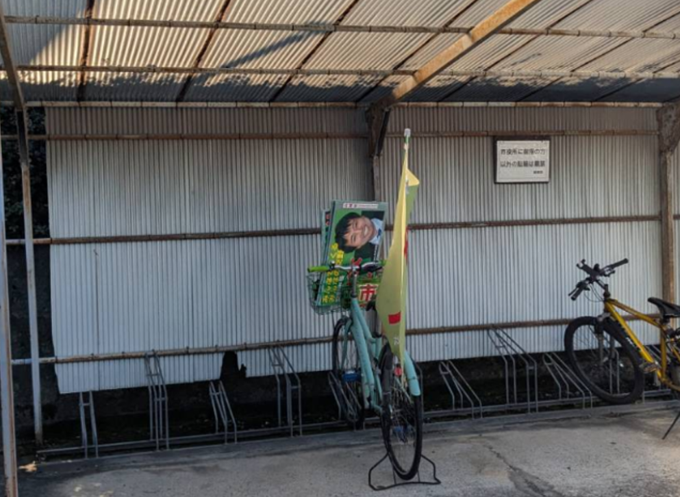 〝相棒〟ののぼり付き自転車は市庁舎内の駐輪場に置かれている。時にはかごに自身のポスターが置かれたまま。早い話が即席の広報板だ。事実上、市庁舎内での選挙活動との批判が起きても仕方がない。