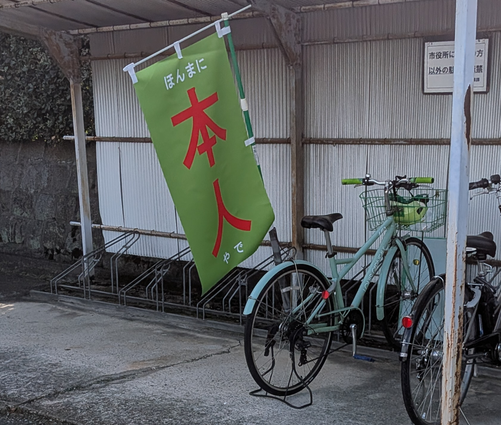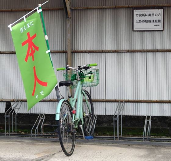 それで本稿の顛末だが、外部から指摘を受けた以上、山本氏はのぼり付き自転車を控えると思った。だが昨日13日も市の駐輪場には何事もなかったかのように相棒号の姿が…。聞く耳持たぬということか。どうやら交野市役所にはのぼりやプラカードなどを持ち込んでも容認されるようだ。