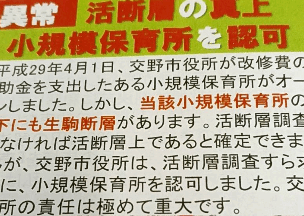 2017年1月17日にブログ「取り戻そう、私たちの交野」で同園のことを「Kは交野の森友学園」などとなじった。当時は森友学園問題が盛んな時期だ。世相に敏感な保護者からも事情を説明するように求められた。それ以外にも「園は誤って認可された」「府にも嘘の報告」などと攻撃。そして同年5月5日、ブログで活断層の上に保育園が建つといった偽情報を投稿。そして自身の広報誌『交野プレスVol45」(同年7月1日号)では「活断層の真上 小規模保育所を認可」とまで言い出した。
