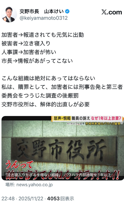 『ツイセキ』の報道を受け11月22日、山本氏はXに「市長→情報があがってこない」と投稿。だがこれはおかしい。Xユーザーたちからも指摘が入った。11月1日のブログにはパワハラについて対応したかのような記述が見られる。