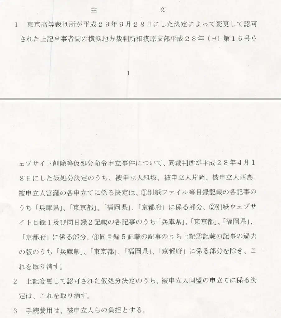 本裁判の結論どおりなので当たり前の内容だが、理由がやたらと長い。「なお、被申立人らの主張する被害拡大を防止するために、個人被申立人ら以外の人格権侵害を受けるおそれのある債権者が別途仮処分を申し立てることは否定されない」と書かれていることに過剰な配慮が感じられる。