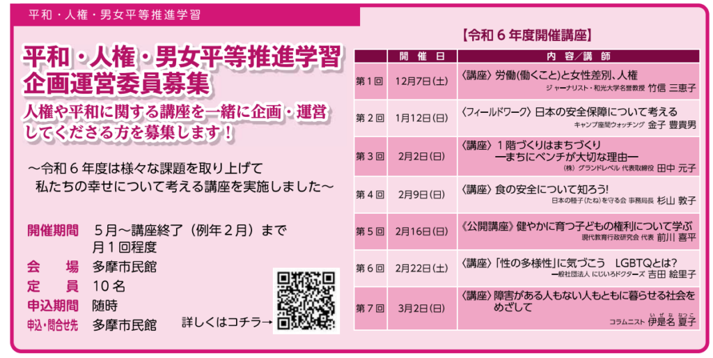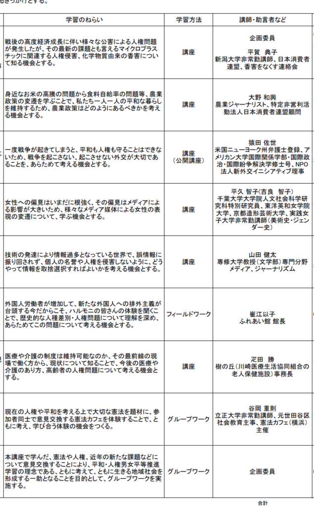 しかし、講師の面々を見ると、これは「偏っている」と言わざるを得ない。市教委の文書では留意点として「平和、人権及び男女平等に関する学習機会をバランスよく提供できるように留意すること」と書かれているが、あまり「バランス」は感じられない。