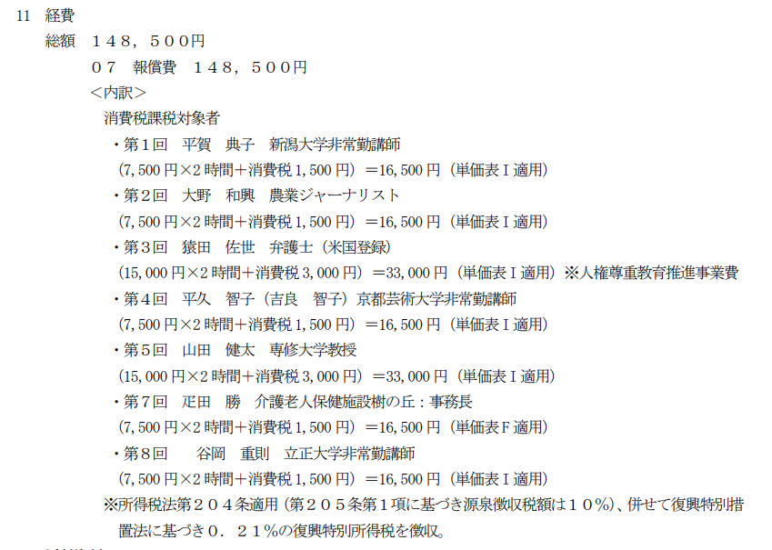 まずはお金の話をすると、8回分の講師の謝礼の合計が14万8500円となっている。1人あたりだと16,500円または33,000円。これは川崎市の基準によるもので、高いか安いかと言えば高いというわけではない。国の基準と比べるとやや高めだが、そもそも国の基準が安すぎるという考え方もあるので、妥当な金額だろう。