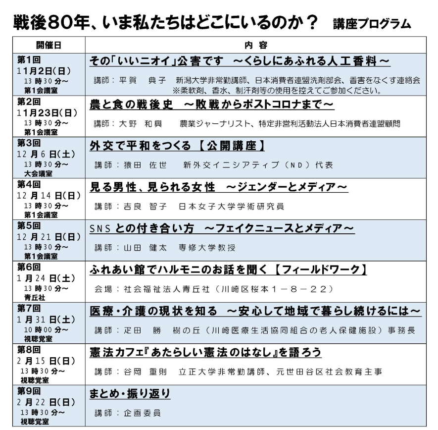 例えば平賀典子氏は合成香料による健康被害「香害」を新しい公害・人権侵害と位置づけ、香料の規制を主張し、日本共産党機関紙「しんぶん赤旗」で「香害をなくそう」という記事を連載している。大野和興氏は「農業ジャーナリスト」という肩書だが、成田空港反対運動にも関わった人物。そして両氏共に日本消費者連盟所属であり、講座が特定団体のための主張をする場になっている。