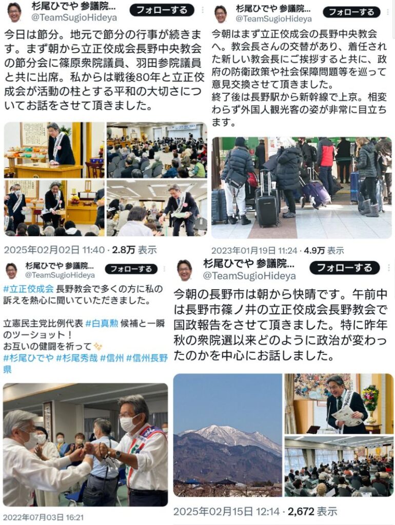 同会は平和、人権、反戦を打ち出してきたが、信者の高齢化は顕著で政治的な影響力を失いつつある。現在は立憲民主党の議員との関係が深く、中でも同党・杉尾秀哉参院議員は立正佼成会との交流をXに投稿してきた。ところが中道改革連合の結党後、なぜか杉尾氏は立正佼成会絡みの投稿を一斉に削除したのだ。
