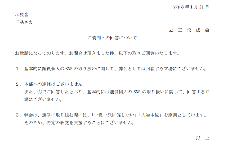 1.基本的に議員個人の SNS の取り扱いに関して、弊会としては回答する立場にございません。