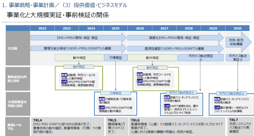 対して大阪府・大阪市は「大阪スーパーシティ全体計画」を策定しておりその事業の一環として「万博会場へのアクセスの一部において、EV(電気)バスなどの自動運転(レベル4相当)を公道で実施」「万博会場内の移動の一部において、EV(電気)バスの自動運転(レベル4相当)を走行中給電などの新技術を搭載し実施」を挙げている。EVバスの実証実験が失敗した以上、大阪府・大阪市も方針転換が必要になるだろう。