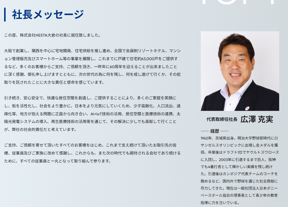 基本的に野球関係者が多く起用されるのは清瀧静男・代表取締役CEO兼COOが甲子園出場経験を持つ野球好きだからだろう。ただCMを一見しただけでは一体、何の会社なのかよく分からない。1962年創業の「大倉建設」を前身とした総合不動産・住宅メーカーなのだが、Webサイトのトップページには「HESTAソーラー」という太陽光発電パネルが掲載されている。
