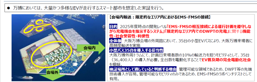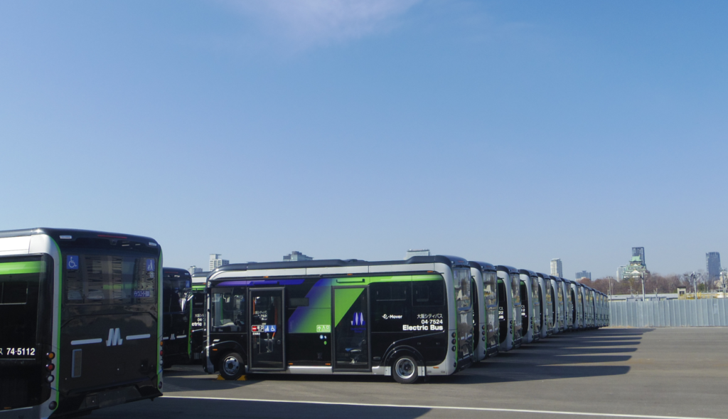 このスキームに約103億円の補助金が支給された。当初計画は大阪・関西万博で電気バスを輸送用で使用した後、市バスに転用するはずだった。ところが大阪メトロが導入したEVMJ(株式会社EVモーターズ・ジャパン)のEVバスが「ハンドル操作と逆方向へ進む」「ブレーキが効かない」などの重大な不具合・事故が相次いだ。