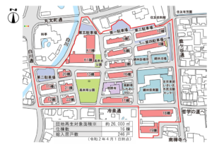 この天王町交差点からクエストを開始した。地区名に錦林とつくが、これは戦中まで存在した錦林学区あるいは現在の錦林小学校区に由来するもので、錦林小学校区が同和地区というわけではない。『同和地区精密調査報告書』によれば当時から鉄筋の公営団地があって周囲と異なった景観をしており、同和地区の境界は極めて明白であるという。