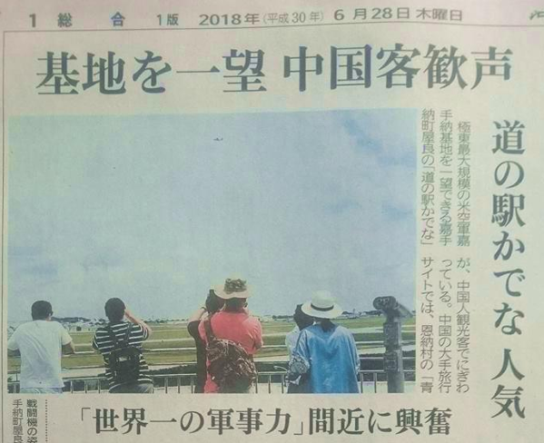 『沖縄タイムス』(2018年6月28日号)の一面記事には驚いた。「基地を一望 中国客歓声 道の駅かでな人気 「世界一の軍事力」間近に興奮」と同紙は報じたのだ。