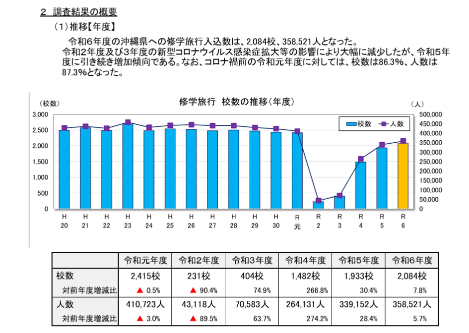 2001年の県議会では、アメリカ同時多発テロ事件の風評被害により、沖縄観光のキャンセルが相次ぎ、修学旅行だけでも363校、8万4790人に上ったと報告された。同事件以外でもイラク戦争、コロナ禍などが起きるたびに県議会でも修学旅行の減少が問題視されてきた。観光依存が高い沖縄にとって修学旅行の減少は深刻な問題なのだ。