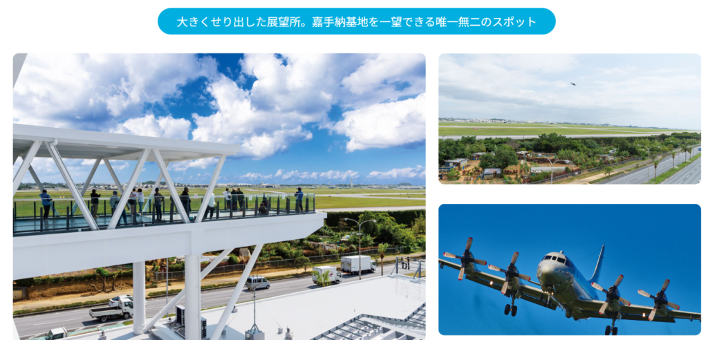 「道の駅かでな」(嘉手納町屋良)は展望台から嘉手納基地(嘉手納飛行場)が一望できるスポットで人気だ。もちろん修学旅行の見学コースに組み込む学校もあるという。