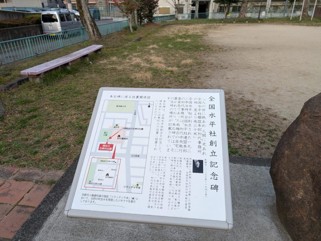 楽只児童公園に、ここが部落であると分かるようなものがある。ここが水平社創立の場所の1つと言えるのは、全国水平社の本部事務所兼初代委員長の自宅があったからである。